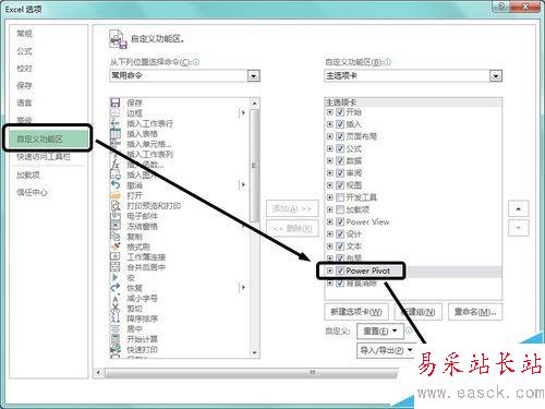 3、勾選“Power Pivot”復選框。彈出“Excel選項”對話框,單擊“自定義功能區”選項,在右側面板的列表框中勾選“Power Pivot”復選框,最后單擊“確定”按鈕,如下圖所示。