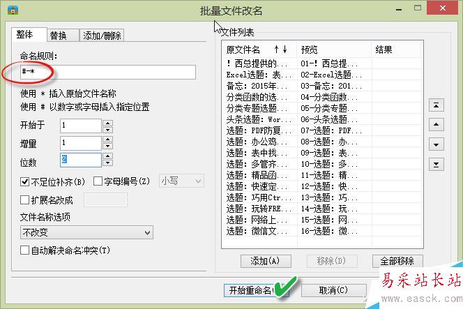 在彈出的更名窗口的“整體”標簽頁下的“命名規則”框中輸入“#-*”,設置編號始于1、增量1、位數2,然后點擊“開始重命名”按鈕,即可完成批量文件的重命名。