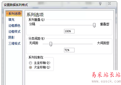 4、選擇圖表“系列1”,設(shè)置系列選項(xiàng)如圖4所示,填充為“純色填充——藍(lán)色”,邊框顏色為“無(wú)線條”。
