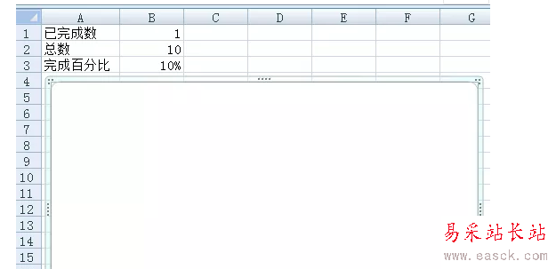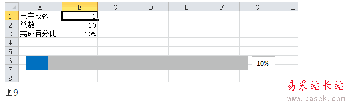 9、此時(shí),我們改變已完成數(shù)的值,圖表會(huì)自動(dòng)更新,展示進(jìn)度情況,如圖9所示。在圖表的右側(cè),添加了一個(gè)文本框,與單元格B3鏈接,以顯示進(jìn)度值。