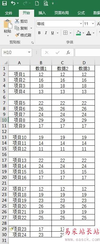2、在工作表中錄入制作柱狀圖的數據,把數據進行分組,中間插入空行占位。
