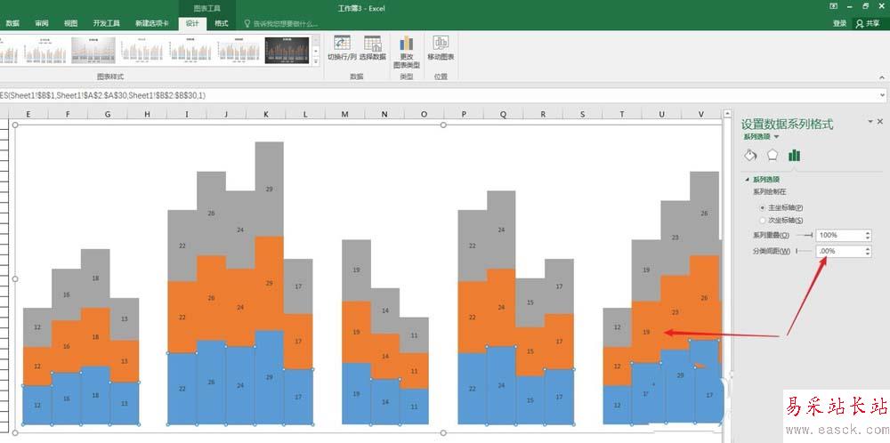 6、雙擊柱形,在右側自動打開的設置窗口中,把【分類間距】設置為0,則各組數據之間沒有了空白。