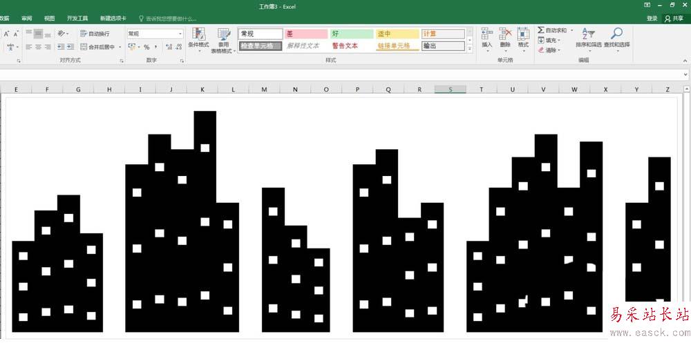 9、這樣,就得到了最終的效果圖。柱形就好像是一棟一棟的高樓大廈,中間的空白就是每一條街道,柱形中的白色小框就好像是開著燈的窗戶。
