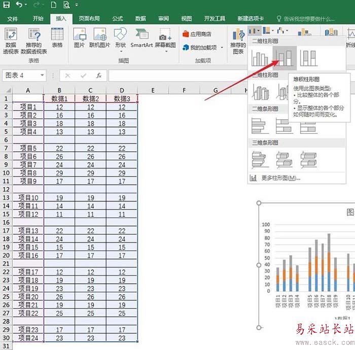 3、全選數據,點擊【插入】—【堆積柱形圖】。