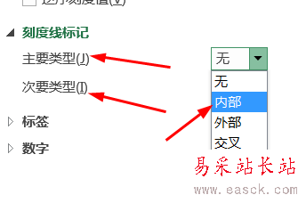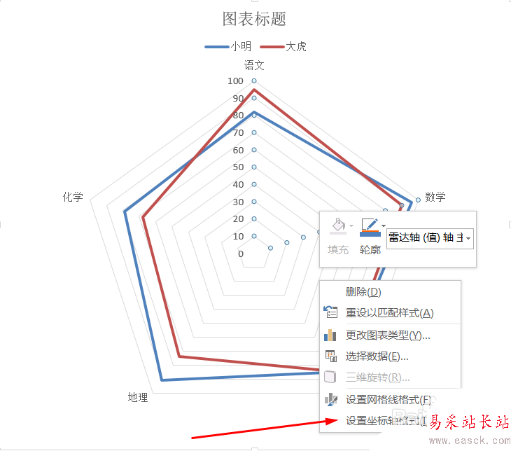 3、可以發現,上面雷達圖中沒有射線,需要設置一下;點擊雷達圖中的網格線→右鍵→設置坐標軸格式→刻度線標記:設置一下,射線就出現了。