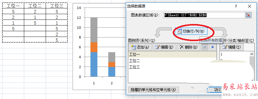 7、點擊切換行/列,這時才是我們想要的山積圖