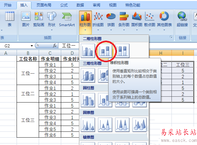 4、然后“插入”-“柱狀圖”-“堆積柱形圖”