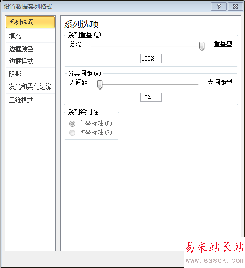 2、選中柱形,右擊選擇“設置數據系列格式”:系列選項:設置“系列重疊為100%”,“分類間距為0%”填充設置如下圖二效果如圖三