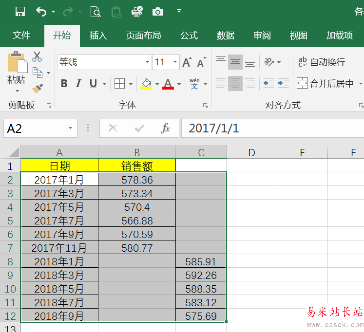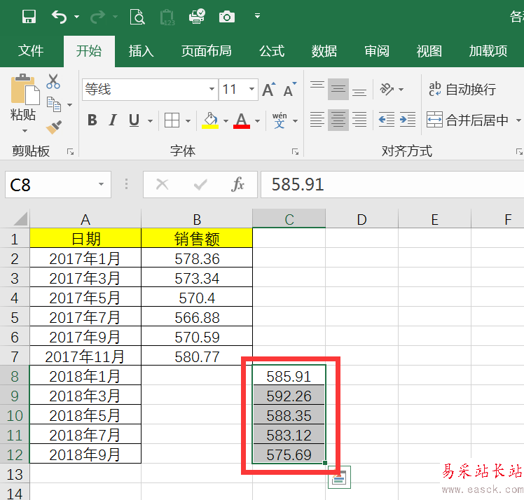 2、選中2018年銷售額數據,并按下Ctrl+x,完成數據剪切。