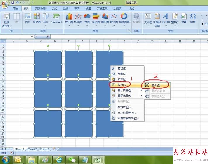 3、按住shfit,選中所有9個矩形后,點擊右鍵,選擇組合中的組合,讓這九個矩形成為一個整體。