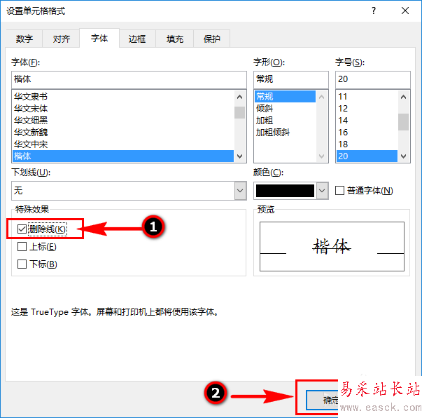 5、最后,我們點擊“刪除線”前面的小方框,即該項內容就被選定了,再點擊“確認”按鈕,這樣Excel單元格中內容中間就畫上橫線啦!如圖所示: