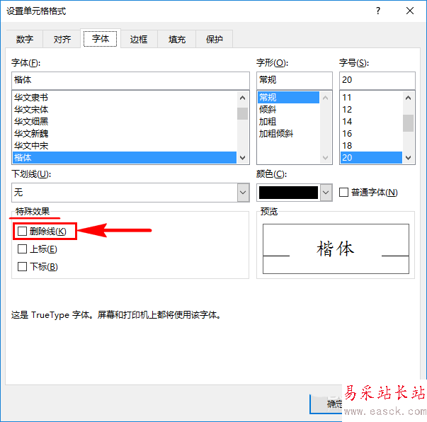 4、然后在“字體”選項中找到“特殊效果”,并在其下方中找到“刪除線”這一項。如圖所示: