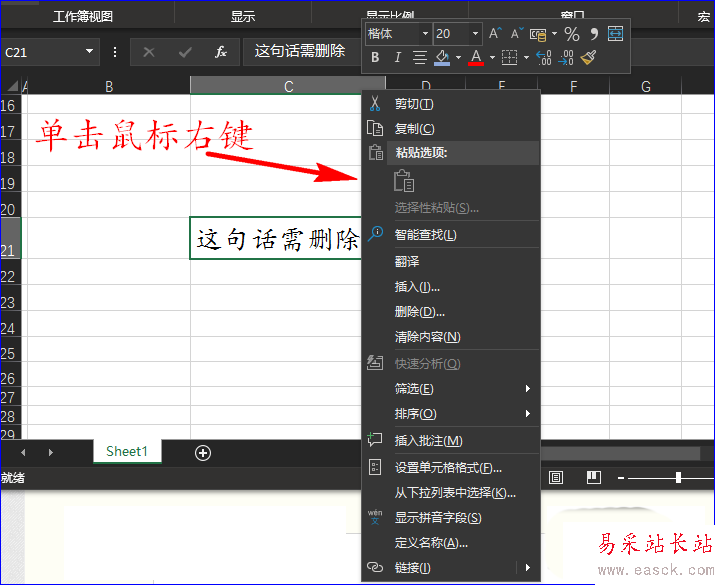 1、打開Excel表格,選中需要畫橫線內容所在的單元格,然后單擊鼠標右鍵,這時將會出現擴展框。如圖所示: