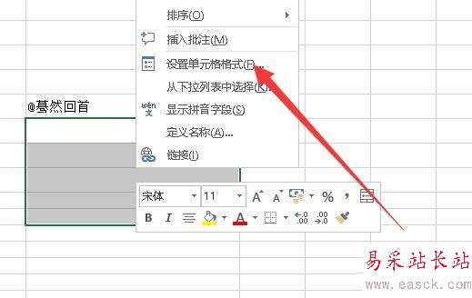 1、我們也可以選中想要輸入@符號的單元格,然后右鍵點擊鍵中的單元格,在彈出菜單中選擇“設置單元格格式”菜單項。