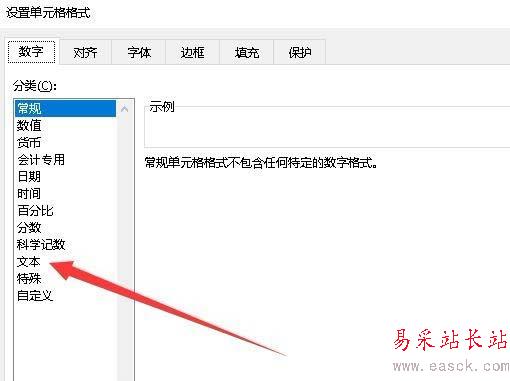 2、接下來在打開的設置單元格格式窗口中選中“文本”菜單項。