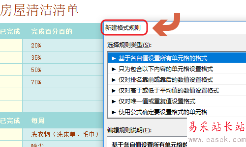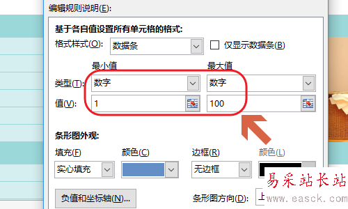 4、接著就會彈出“新建格式規則”對話框了,我們在該對話框將“類型”由自動更改為數字,然后最小值和最大值分別設置為1和100;