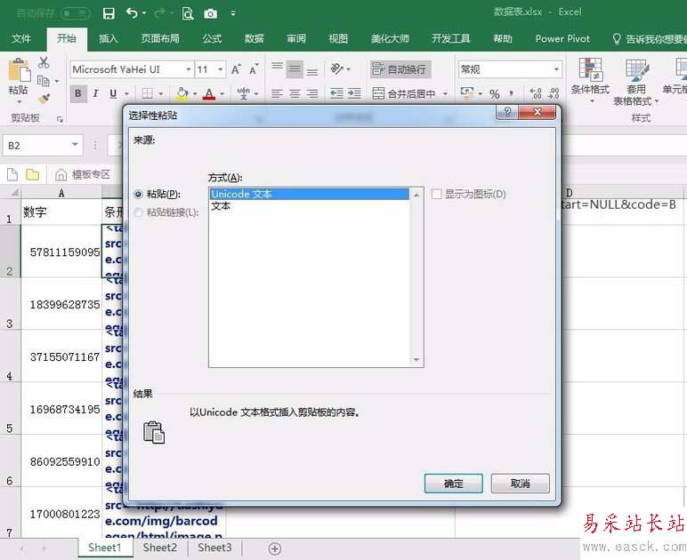 8、再次切換到EXCEL主界面,在B2單元格上單擊鼠標(biāo)右鍵選擇“選擇性粘貼”,選擇Unicode文本。