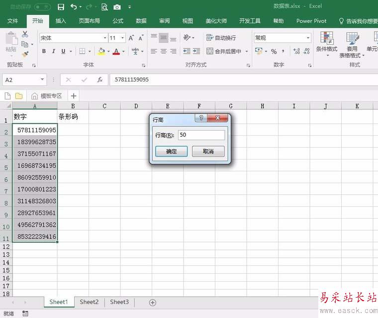 2、然后選中數(shù)據(jù)區(qū)域并將該區(qū)域行高設(shè)置為50。