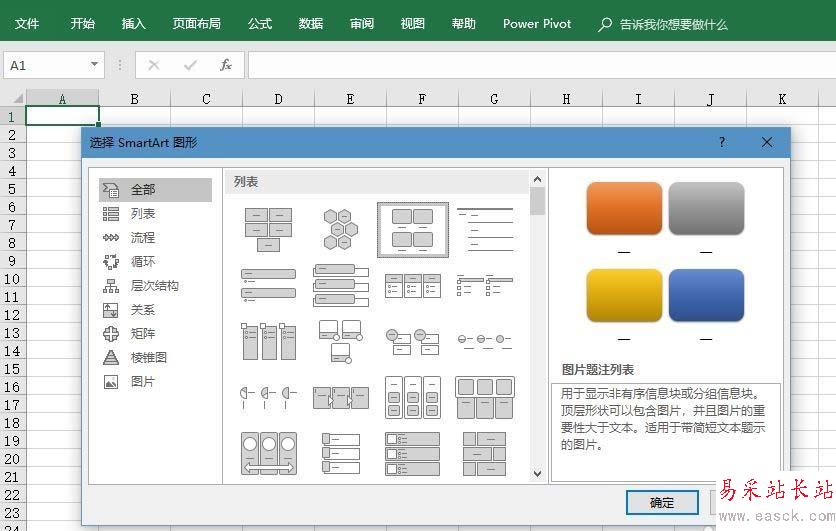 2、在彈出的SmartArt圖形選擇對(duì)話框中,選擇右側(cè)的“圖片題注列表”按鈕,然后,點(diǎn)擊“確認(rèn)”按鈕。