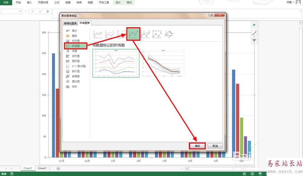 8、在圖表類型中,我們依次選擇:"折線圖">"帶數據標記的折線圖">點擊"確定"。