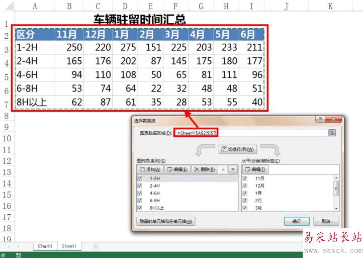 1、下圖中是我們的"數據源",我們要制作一個車輛駐留時間分析的圖表。