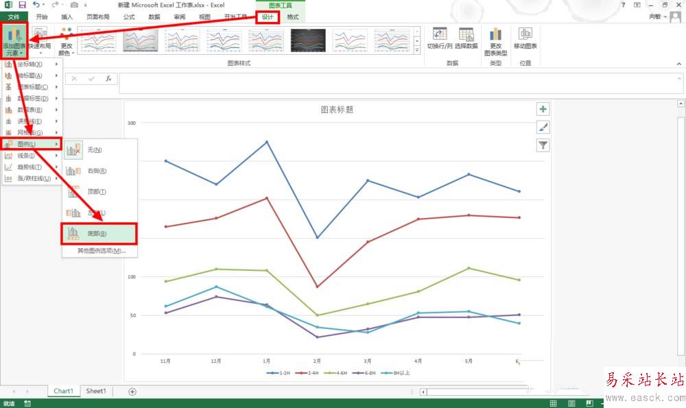 9、此外,我們還可以給圖表添加圖例。依次選擇:"設計">"添加圖表元素">"圖例">"底部"。