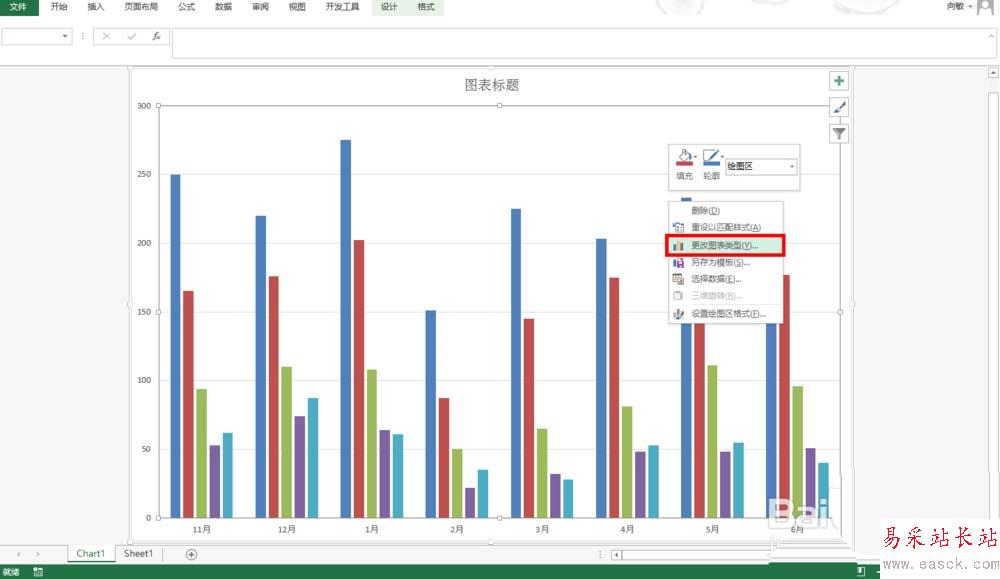 7、這時,最基礎的Chart圖表就制作好了。但本例我們需要的是折線圖,我們鼠標右鍵單擊后選擇"更改圖表類型"。