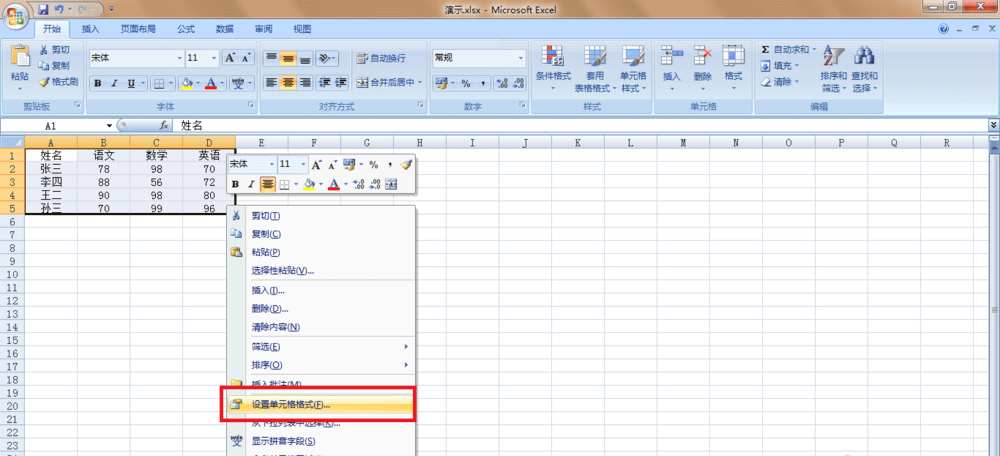 3、選中該表格,右擊鼠標(biāo),選擇【設(shè)置單元格格式】,如圖。