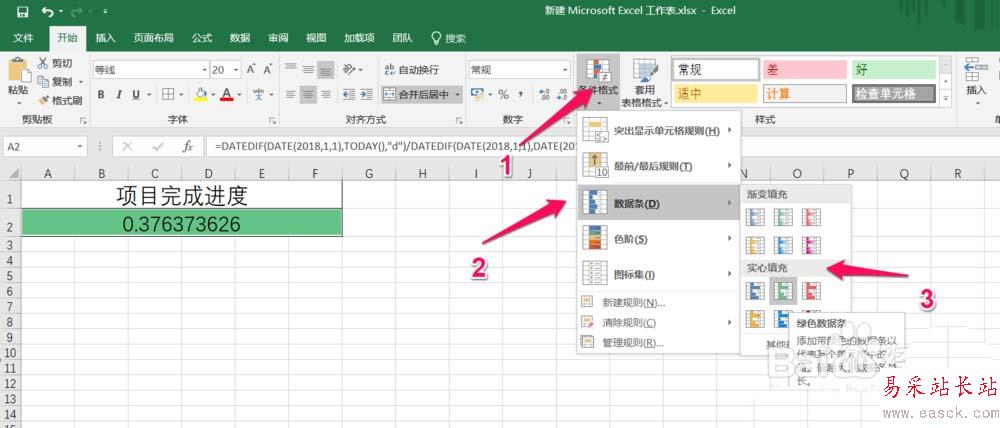 4、然后選中進度的單元格,然后按照下圖中紅色箭頭指示位置依次點擊 條件格式->數據條->實心填充 中的任何一種顏色即可,這里小編選擇綠色,如下圖:
