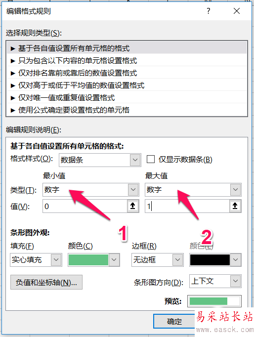 8、在彈出的編輯格式規則對話框中 將最小值和最大值的類型都設置為數字,最小值的值設置為0,最大值的值設置為1,如下圖: