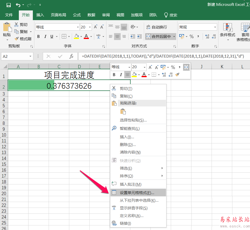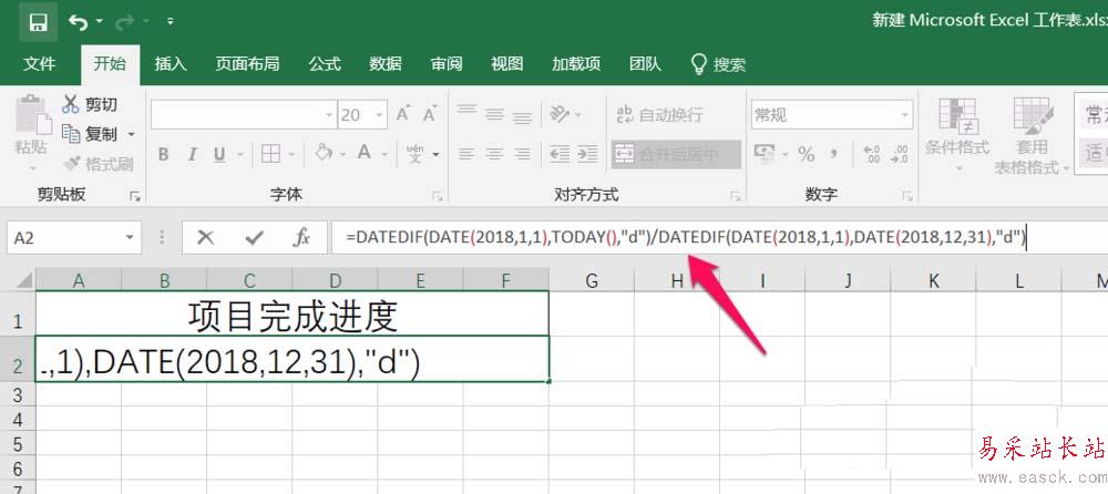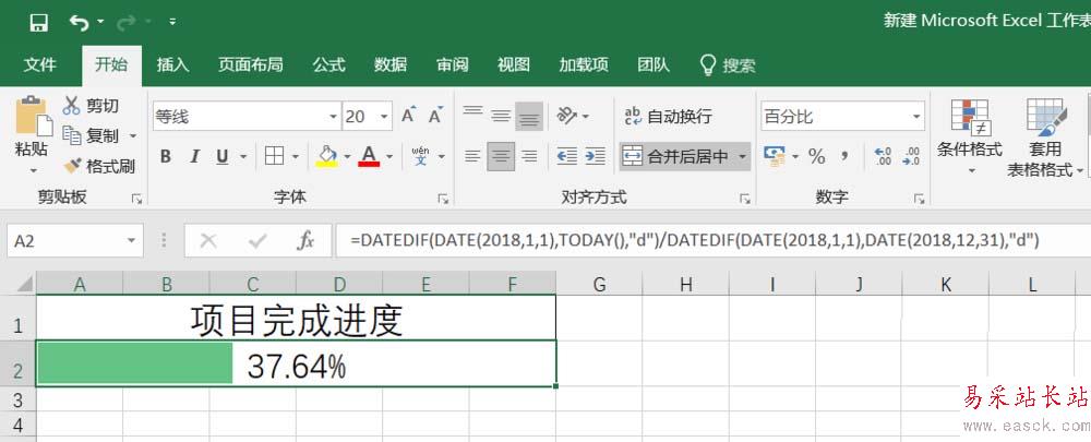 2、然后在單元格中輸入公式 =DATEDIF(DATE(2018,1,1),TODAY(),"d")/DATEDIF(DATE(2018,1,1),DATE(2018,12,31),"d"),其中DATEDIF函數為計算兩個日期之間的差值,DATE為日期函數,TODAY函數為今天的日期,這里是計算今天到20180101的日子占全年的百分比,如下圖: