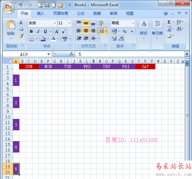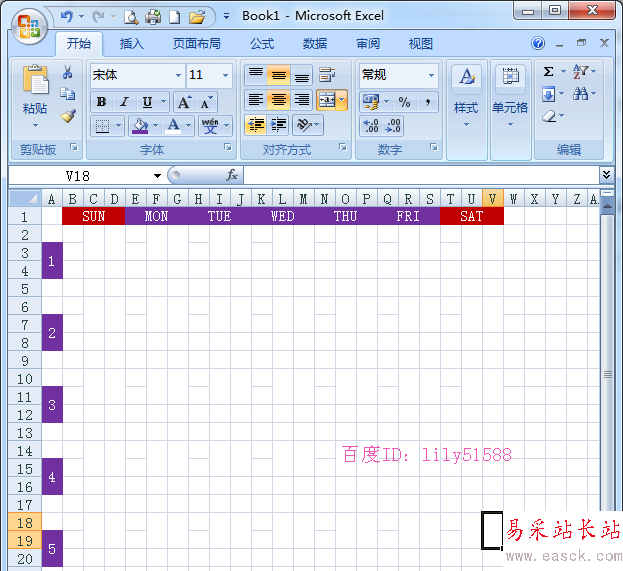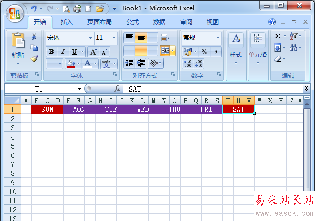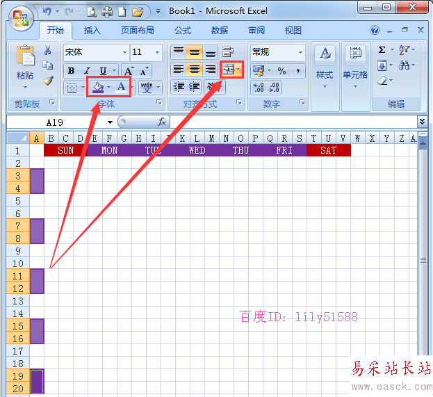 2、把B1到D1的3個單元格選中合并為1個,然后向右拖動鼠標將其它的6組單元格合并。輸入星期的英文字母,將周末填充為紅色,周一到周五填充為紫色,字體為白色。