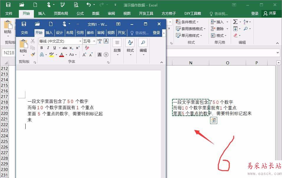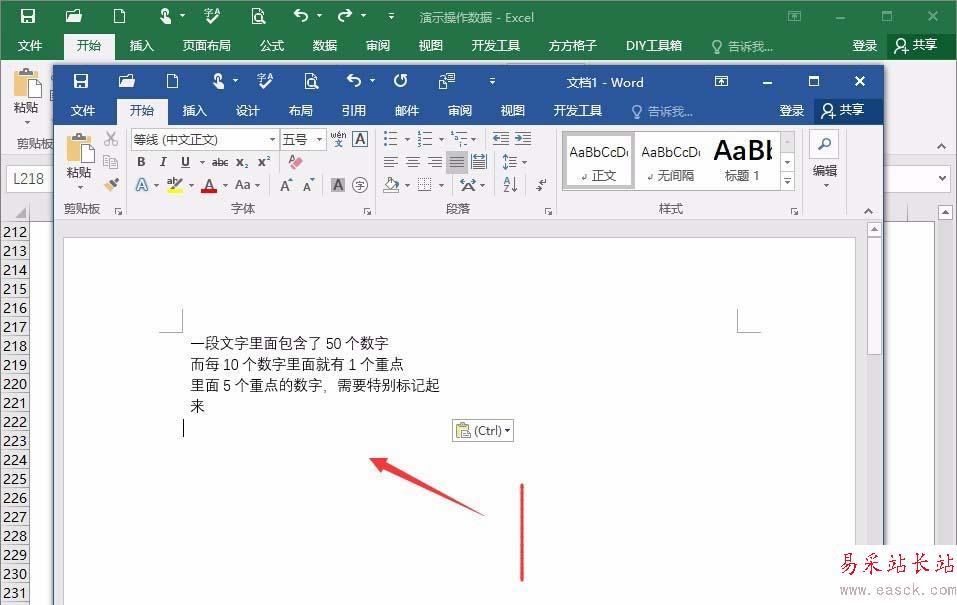 6、然而我們是想在Excel實現(xiàn)效果,而不是Word,所以還要最后一步,那就是把Word的內(nèi)容,再復(fù)制到Excel里面,這個直接Ctrl+C以及Ctrl+V即可。
