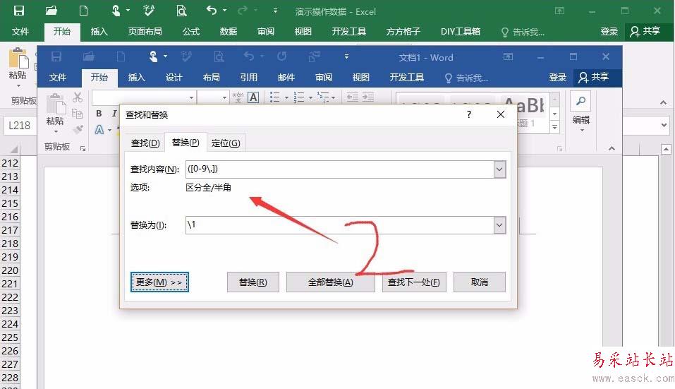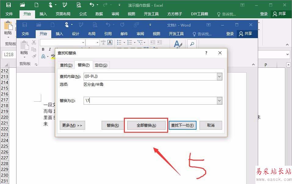 2、打開Word的替換功能,(快捷鍵為Ctrl+H),然后輸入一個,([0-9/.])以及/1,注意不能寫反了,還有就是注意一下空格,加空格與不加空格,結(jié)果是不一樣的。