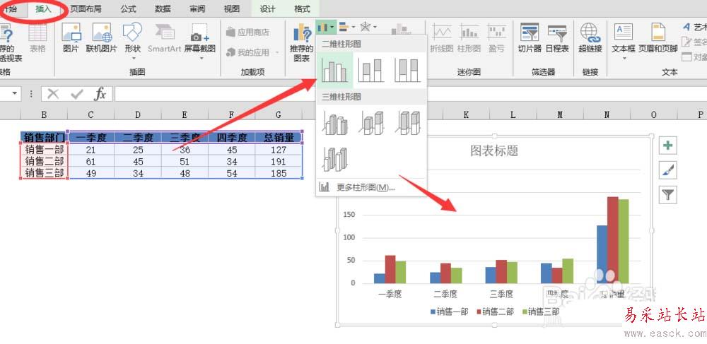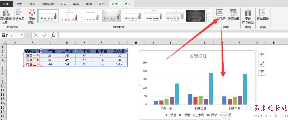 3、切換行列。選擇工具欄——設計——數(shù)據(jù),切換行列,讓銷售部門作為橫坐標水平軸標簽。