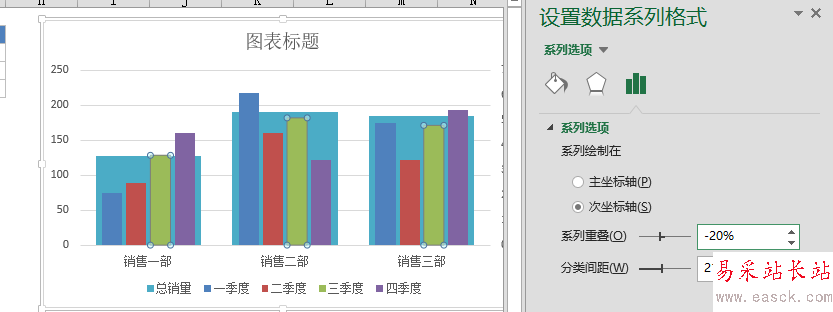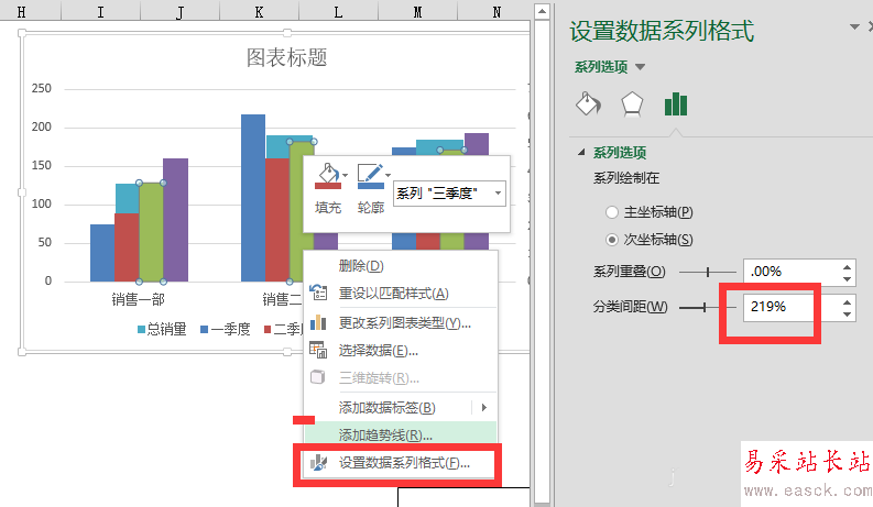 5、單擊,圖表右鍵,選擇設置數(shù)據(jù)系列格式,分別設置總銷量和各季度的分類間距。