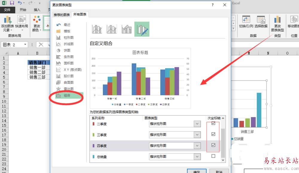 4、繼續(xù)選擇工具欄——設計——更改圖表類型,單擊更改圖表類型,彈出對話框,選擇組合,更改圖表為簇狀柱形圖,設置第一、二、三、四季度為次坐標。