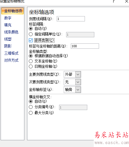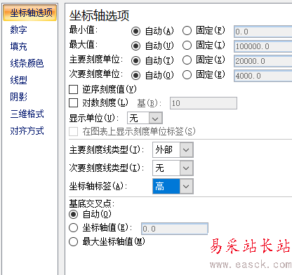 5、設(shè)置橫坐標(biāo)軸格式。同步驟4 進(jìn)行橫坐標(biāo)軸的設(shè)置,標(biāo)簽選擇高