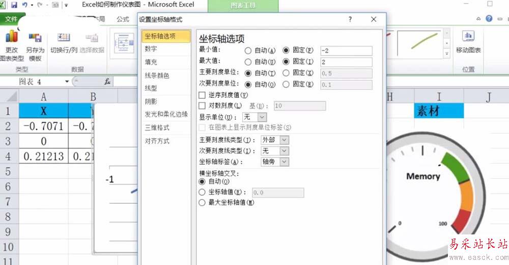 2、然后雙擊圖表的橫坐標軸,將最大值和最小值勾選成固定,分別設值為2和-2,縱坐標軸同樣這樣設置。