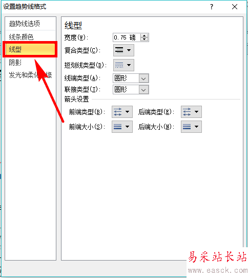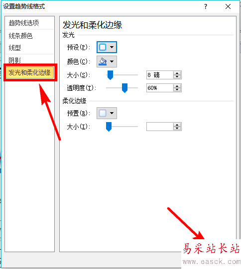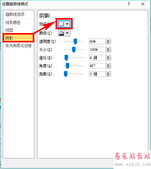 6、陰影設(shè)置。設(shè)置好趨勢線的線型之后,在左側(cè)的項(xiàng)目欄中點(diǎn)擊陰影,然后在右側(cè)區(qū)域中點(diǎn)擊【預(yù)設(shè)】后的下拉箭頭,這樣可以看到有很多的預(yù)設(shè)選項(xiàng),我們可以隨意選擇。我們也可以點(diǎn)擊【顏色】后方的下拉箭頭,在這里我們可以對陰影的顏色進(jìn)行設(shè)置。如果需要對陰影的透明度和大小進(jìn)行設(shè)置的話,可以調(diào)整圖示右側(cè)區(qū)域的滑塊。
