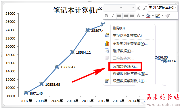 2、添加趨勢線。制作好圖表后,點(diǎn)擊鼠標(biāo)左鍵選中圖表上的線條,然后點(diǎn)擊鼠標(biāo)右鍵,在右鍵項(xiàng)目列表中選擇【添加趨勢線】,如圖所示。