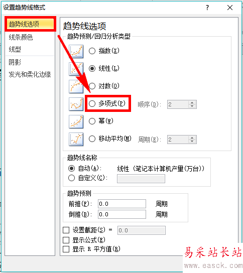 3、進(jìn)入趨勢線設(shè)置頁面。這時(shí)就進(jìn)入到了趨勢線的設(shè)置頁面了,進(jìn)入頁面后首先看到的就是【趨勢線選項(xiàng)】的設(shè)置,在圖示右側(cè)區(qū)域提供了很多種線性回歸分析類型,選擇你需要的類型。比如,小編在這里選的就是【多項(xiàng)式】回歸類型。
