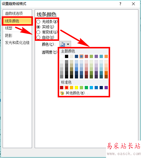 4、線條顏色設(shè)置。設(shè)置好限行回歸的類型之后,點(diǎn)擊設(shè)置頁面左側(cè)菜單欄中的【線條顏色】選項(xiàng),對回歸線的線條屬性進(jìn)行設(shè)置。線條屬性有無線條、實(shí)線等多種類型,這里就根據(jù)自己的需要選擇就行了。點(diǎn)擊圖示位置的油漆桶圖標(biāo)后,在其下方就會出現(xiàn)很多的色塊,點(diǎn)擊相應(yīng)顏色的色塊就能將趨勢線設(shè)置成相應(yīng)的顏色。