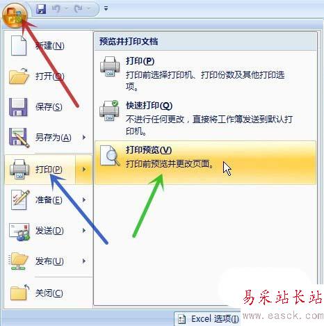 2、點(diǎn)擊左上角的“Office 按鈕”(圖中紅色箭頭所指),在彈出菜單中將鼠標(biāo)指針移至“打印”(圖中藍(lán)色箭頭所指),在彈出菜單中點(diǎn)擊“打印預(yù)覽”(圖中綠色箭頭所指)