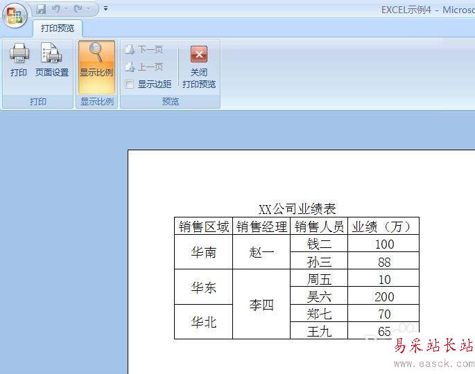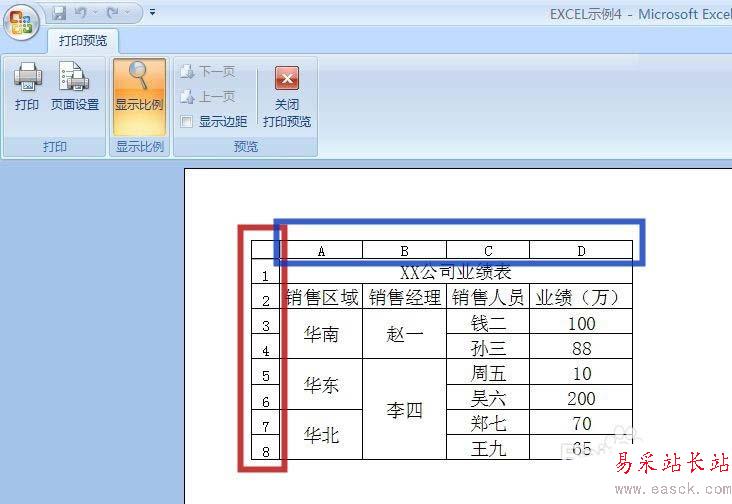 6、再進(jìn)入“打印預(yù)覽”看看,可見(jiàn)行號(hào)(圖中紅框)列標(biāo)(圖中藍(lán)框)都已出現(xiàn)