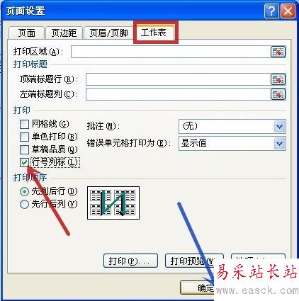 8、在彈出的“工作表”(圖中紅框)中勾選“行號(hào)列標(biāo)”前的方框(圖中紅色箭頭所指),點(diǎn)擊“確定”(圖中藍(lán)色箭頭所指),也可以設(shè)置打印行號(hào)列標(biāo)