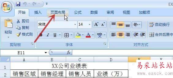 4、回到工作表,點(diǎn)擊頂端的“頁(yè)面布局”選項(xiàng)卡(圖中紅色箭頭所指)