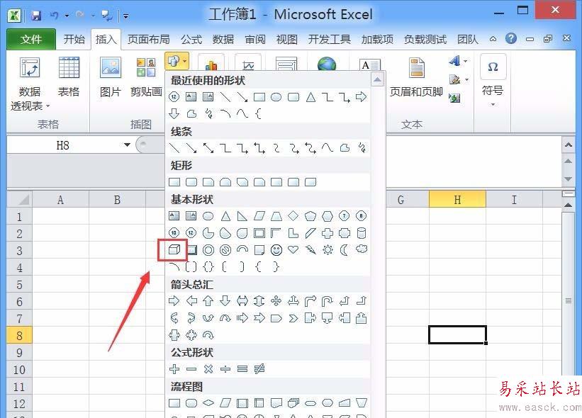 2、打開excel之后我們在插入菜單那里找到形狀選項,點擊形狀選項在其下拉菜單那里找到長方體選項,如圖所示: