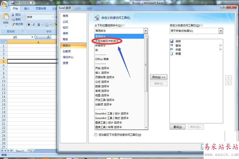 1、首先打開Excel選項的入口就不一樣了,Excel2013我們只需要點(diǎn)擊最上方的三角形下拉按鈕,然后在彈出的窗口里找到"其他命令"即可,如圖;