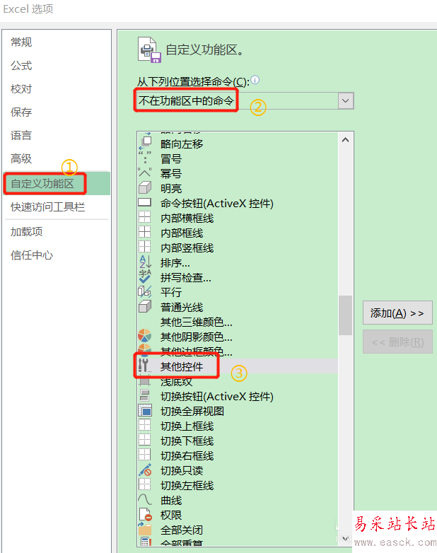 2、接著在彈出的”EXCEL選項“對話框最左側(cè)選擇”自定義“,然后將常用命令改為下拉菜單中的”不在功能區(qū)中的命令“,然后在此命令下找到”其他控件“,之后選擇”添加“